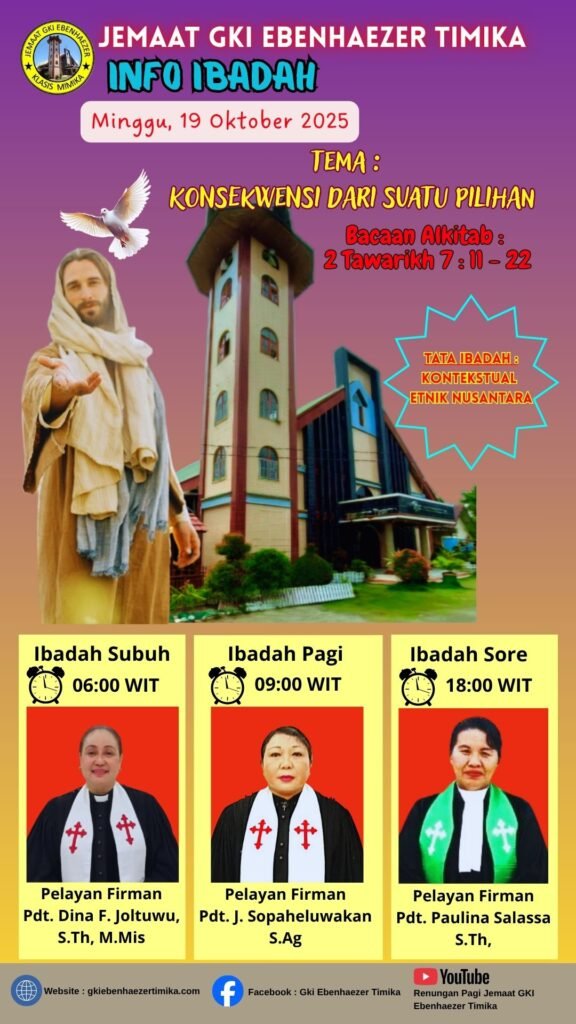 Pelaksana Harian Majelis Jemaat dan Majelis Jemaat GKI Ebenhaezer Timika, mengucapkan selamat Hari Minggu dan Selamat Beribadah bagi Bapak/ Ibu/ Saudara/ Saudari warga jemaat